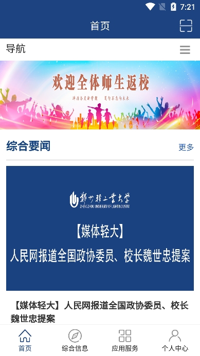 i轻工大是一款专为郑州轻工业大学精心打造的智能校园生活服务软件,汇集学校新闻、图书馆、课程表、实验室、校园卡、校园导航、一卡通消费等服务,帮助学生更顺利地融入学校生活。